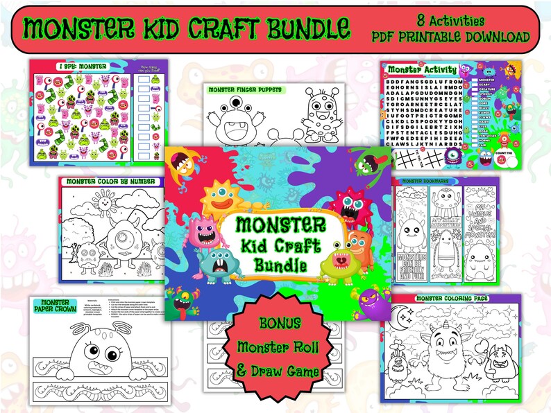 Monster Kid Craft Printable Bundle Bonus Roll and Draw a Monster Game