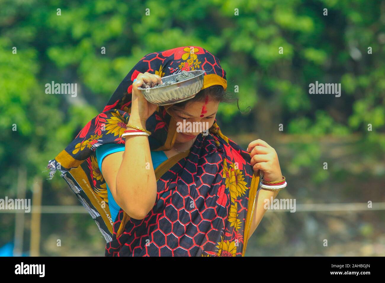 A woman carrying soil to be placed under the banyan tree as offering