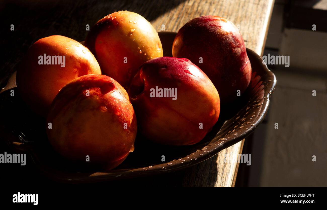 Sunlight illuminates a group of ripe nectarines glistening with water