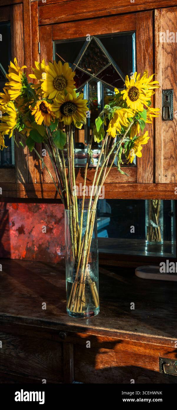 Sunflowers with long stems standing in a simple cylindrical glass vase