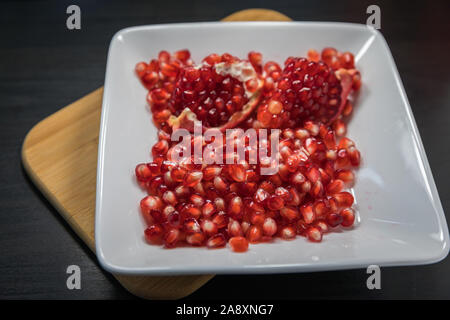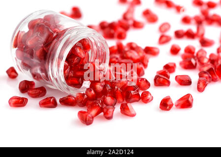 Pomegranate seeds placed in glass jar with scattered seeds on white