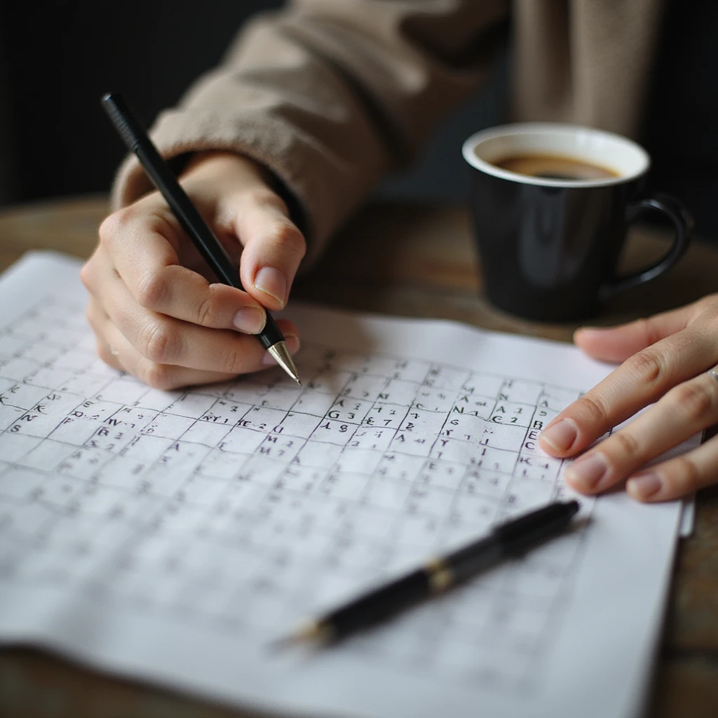 A realistic scene of a person doing a crossword puzzle with a pen and a