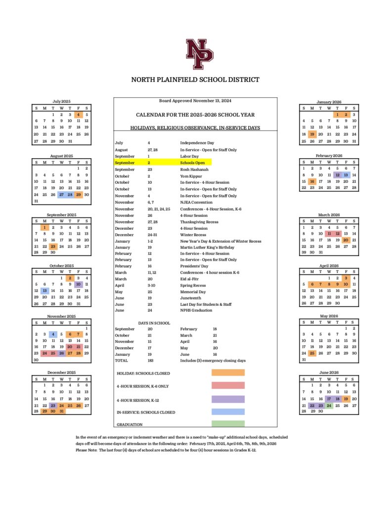 North Plainfield School District Calendar 25 26 Revised PDF EduCounty