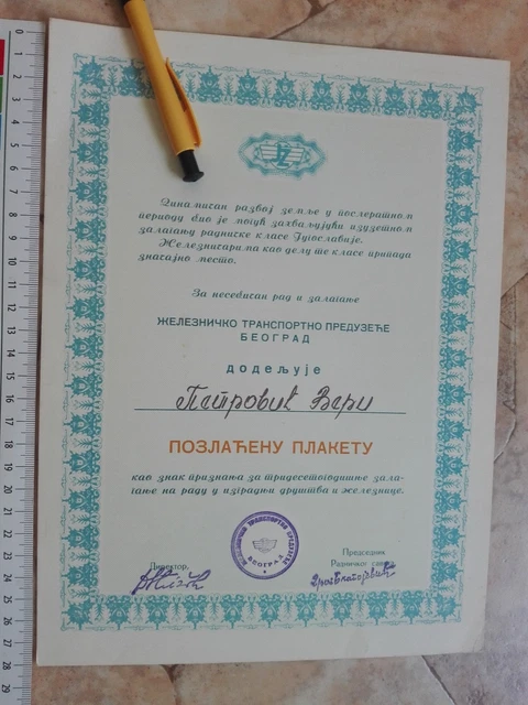 YUGOSLAVIA RAILWAYS DECREE Plaque Certificate Building Railway After
