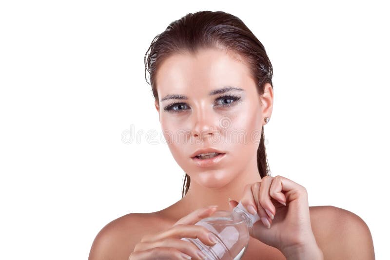 Beauty Portrait of Pretty Girl with Natural Makeup and Glass of Stock