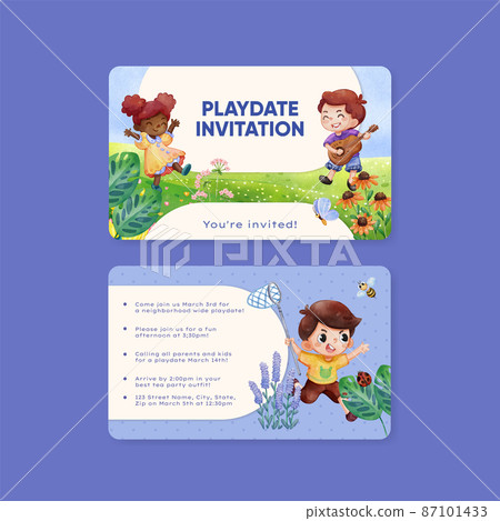 Spring Watercolor Play Date Card Template Featuring Joyful Children