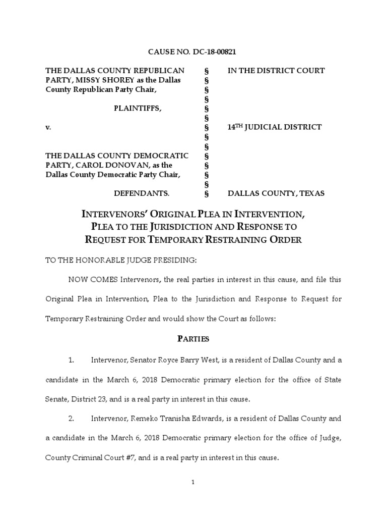 Orig Intervention Plea To Jurisdiction PDF Mootness Standing (Law)
