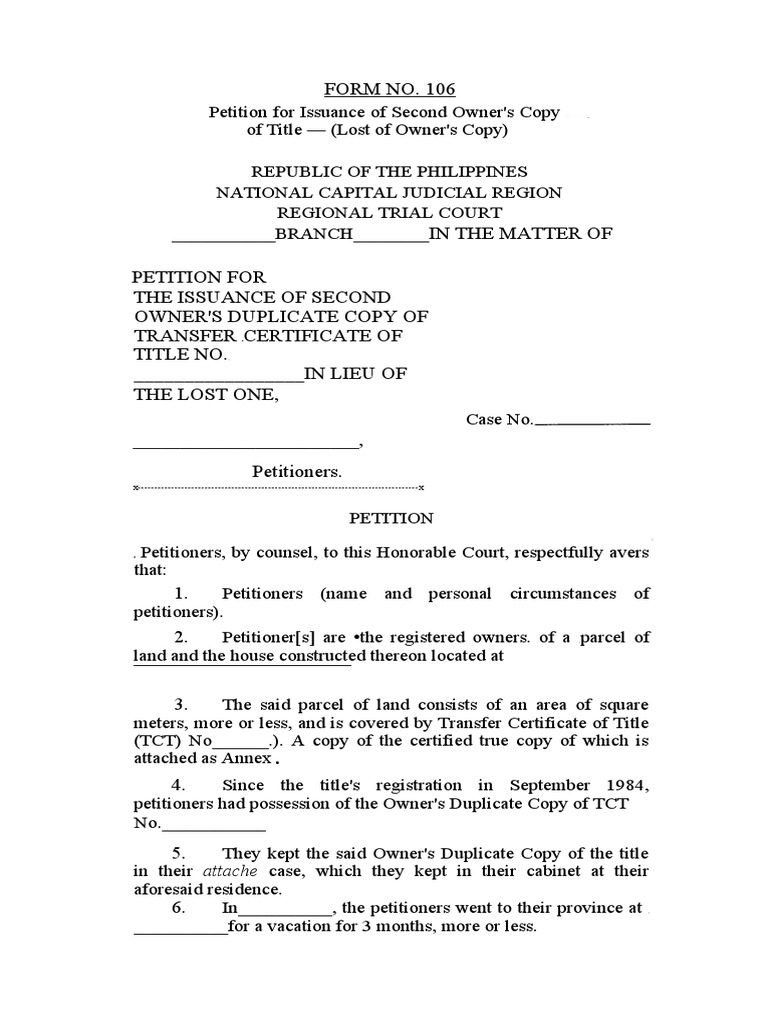 FORM 106 Petition For Issuance of Second Owner #39 s Copy of Title PDF