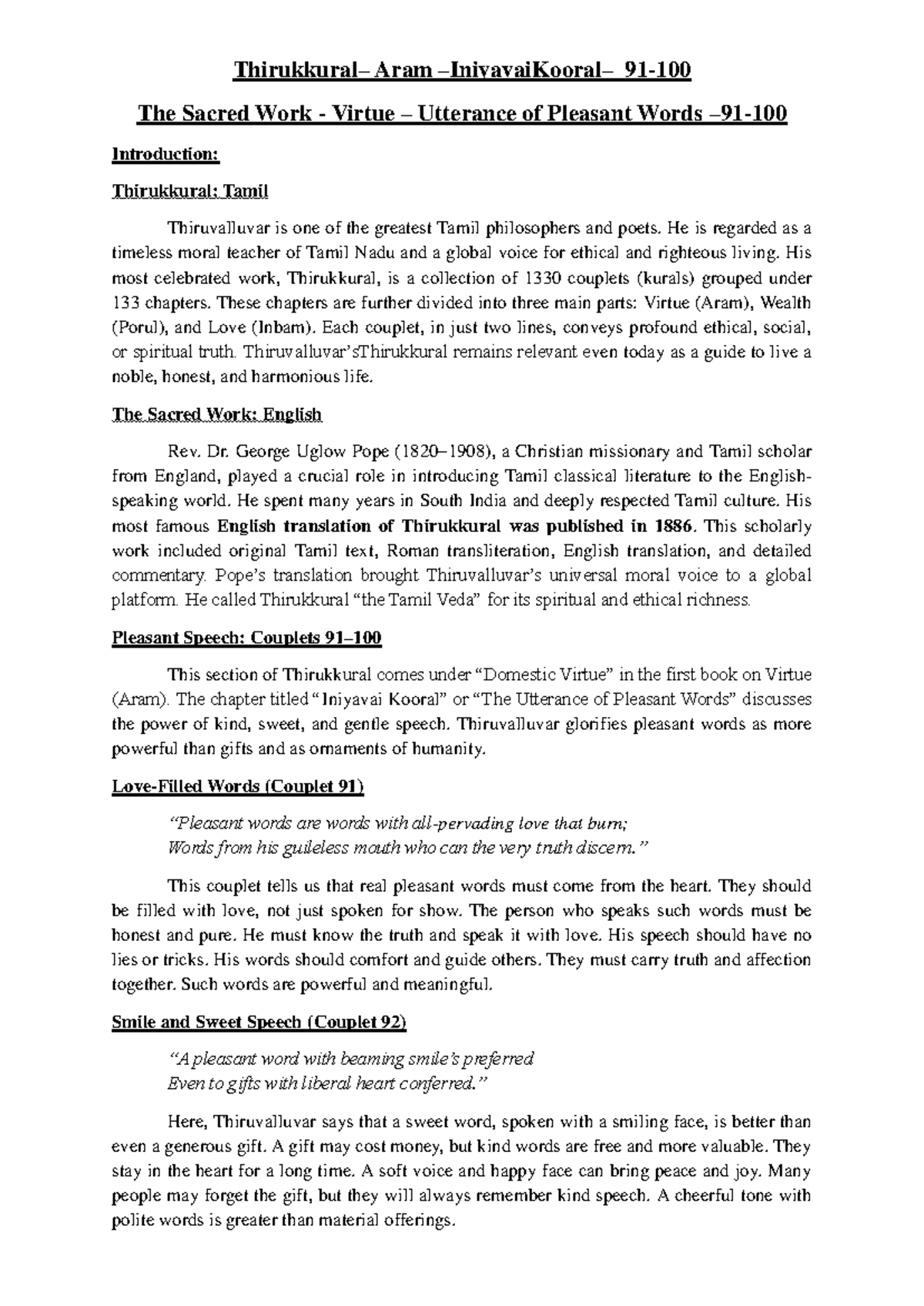 Thirukkural (Tamil) Essay Notes on Virtue and Pleasant Speech Studocu