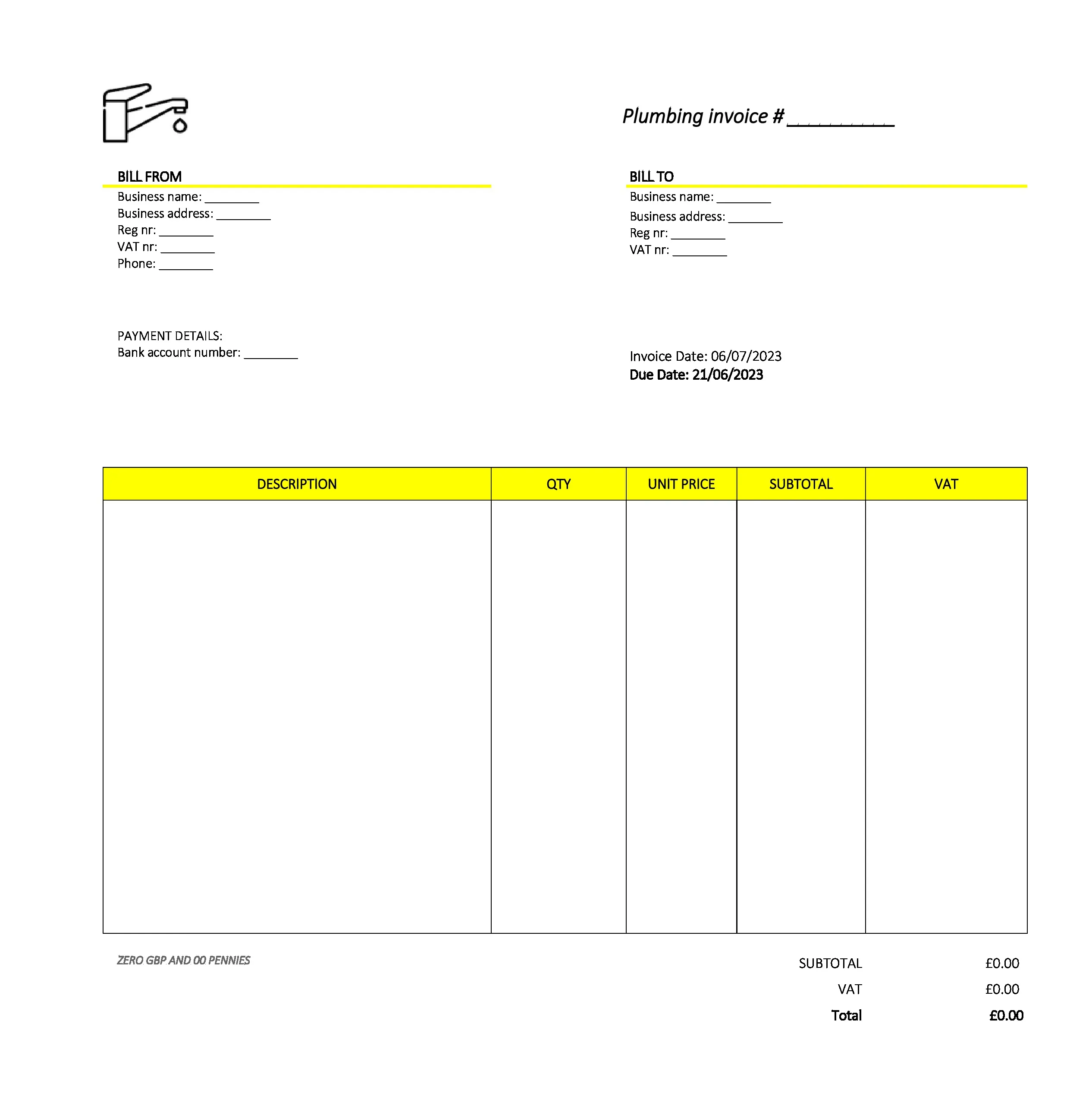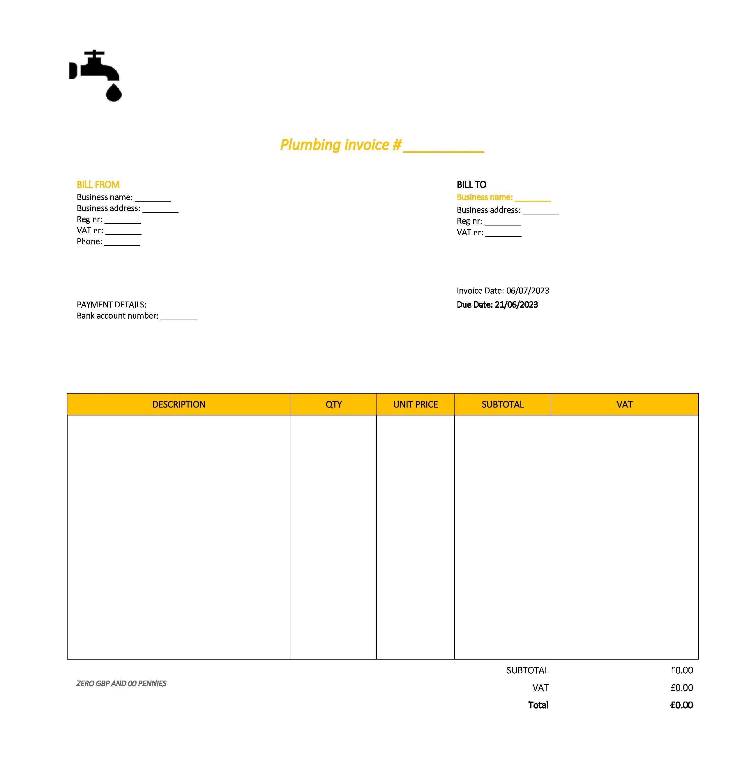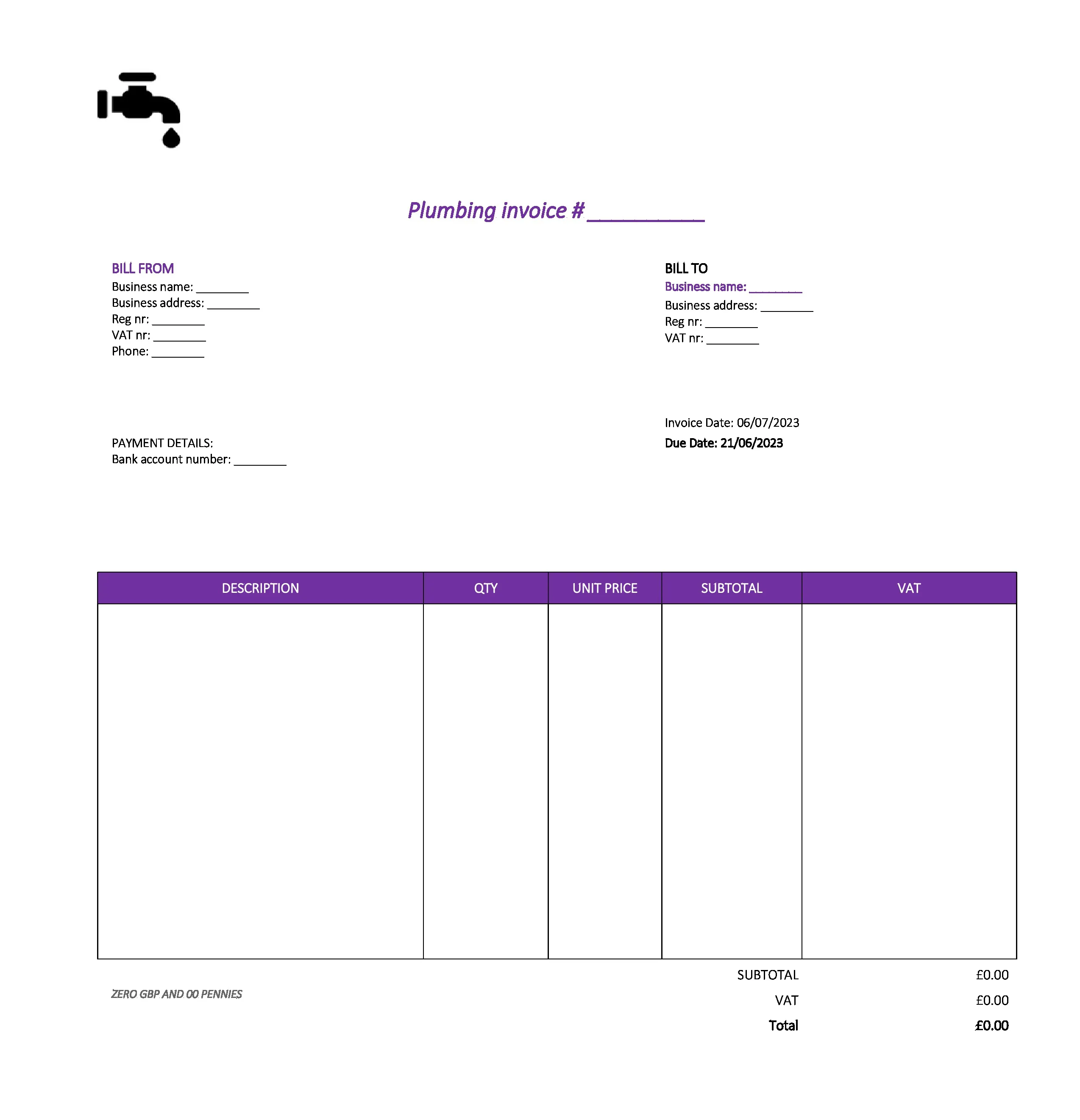 Detailed Plumbing Invoice Template UK Excel / Google sheets