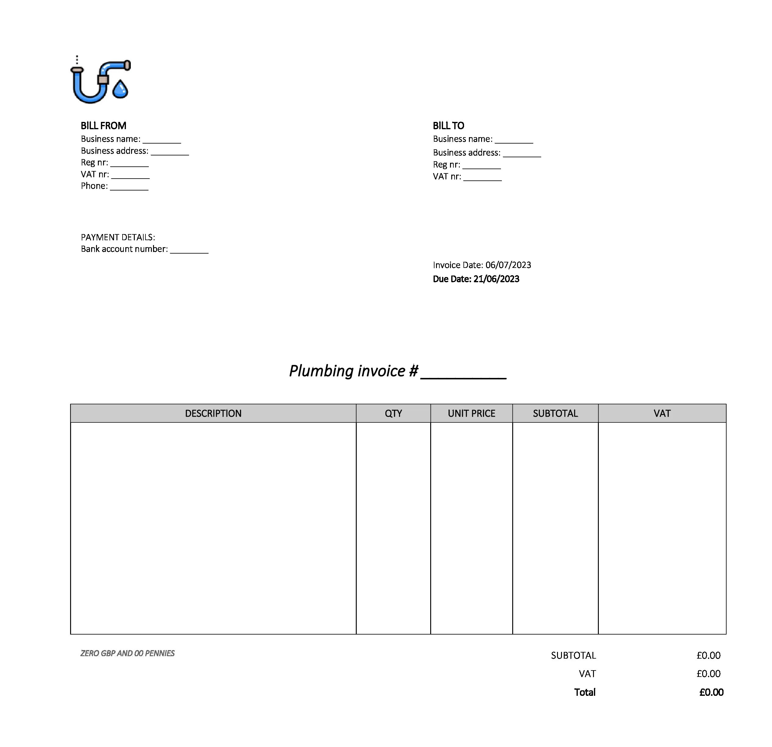 Editable Plumbing Invoice Template UK Word / Google docs