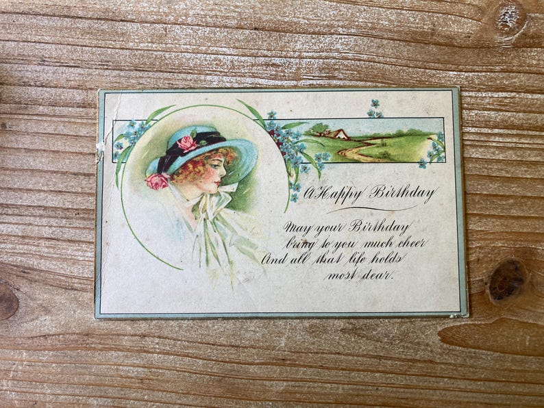 Happy Birthday Woman in Blue Hat Poem Rural Scene Used Antique