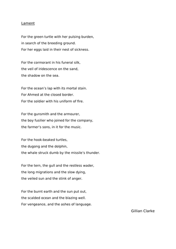 Lament by Gillian Clarke Poetry Analysis by Shaun Chadwick TPT
