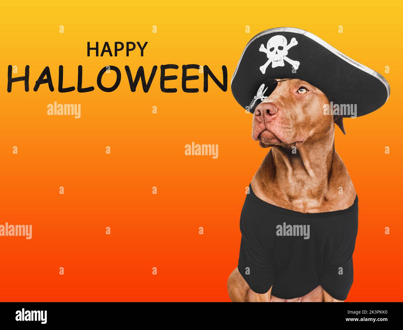 Charming lovable brown dog and pirate costume Bright background