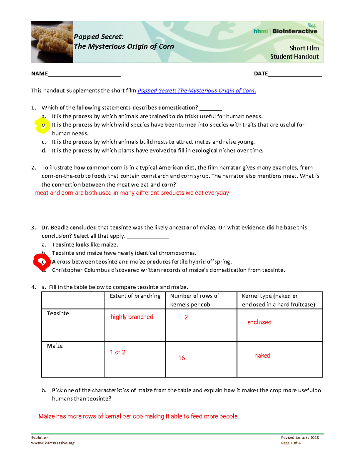 Popped Secret The Mysterious Origin Of Corn Worksheet Answers