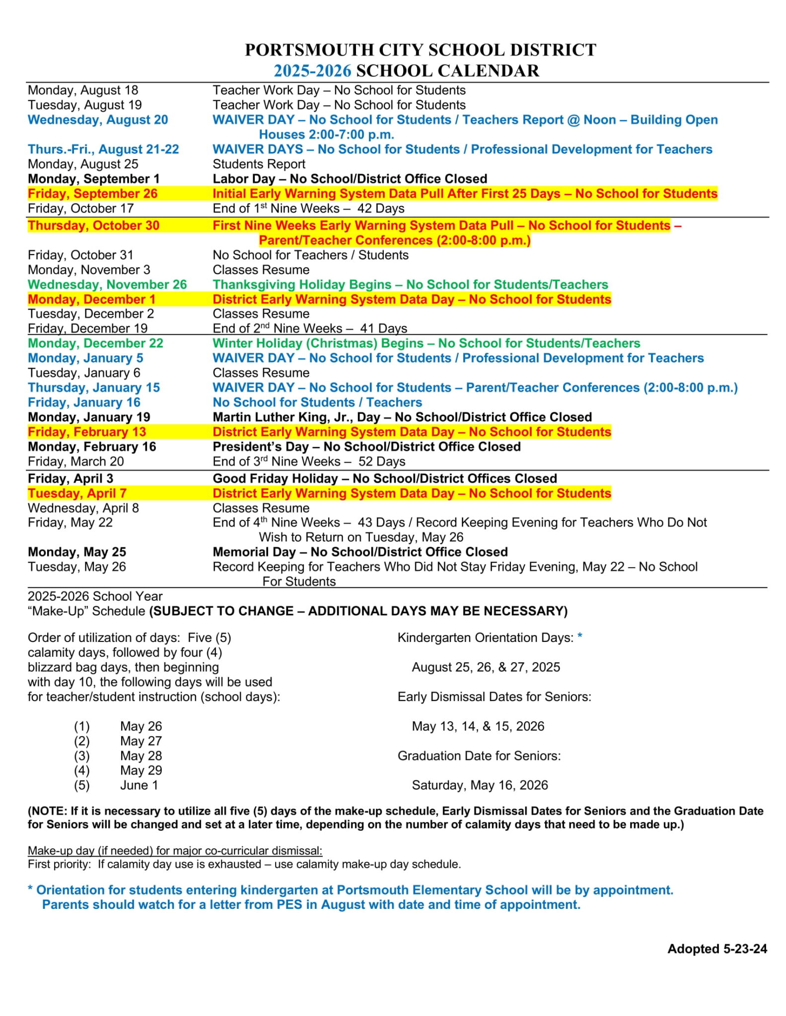 Portsmouth Public Schools Calendar 2025 2026 PDF Holidays