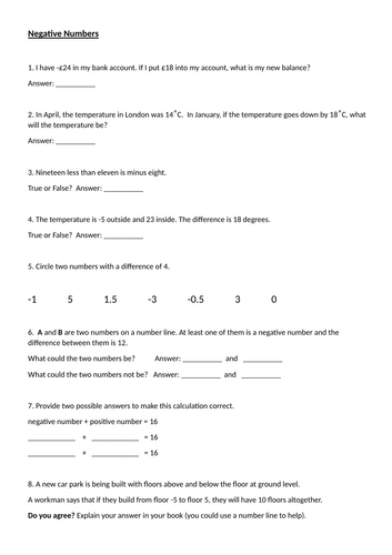 Negative Numbers Worksheet Key Stage 2 PDF Number Worksheets