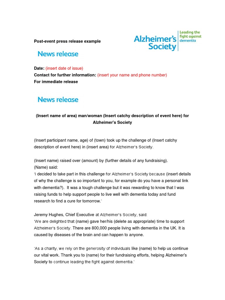 Post Event Press Release Example PDF Alzheimer #39 s Society