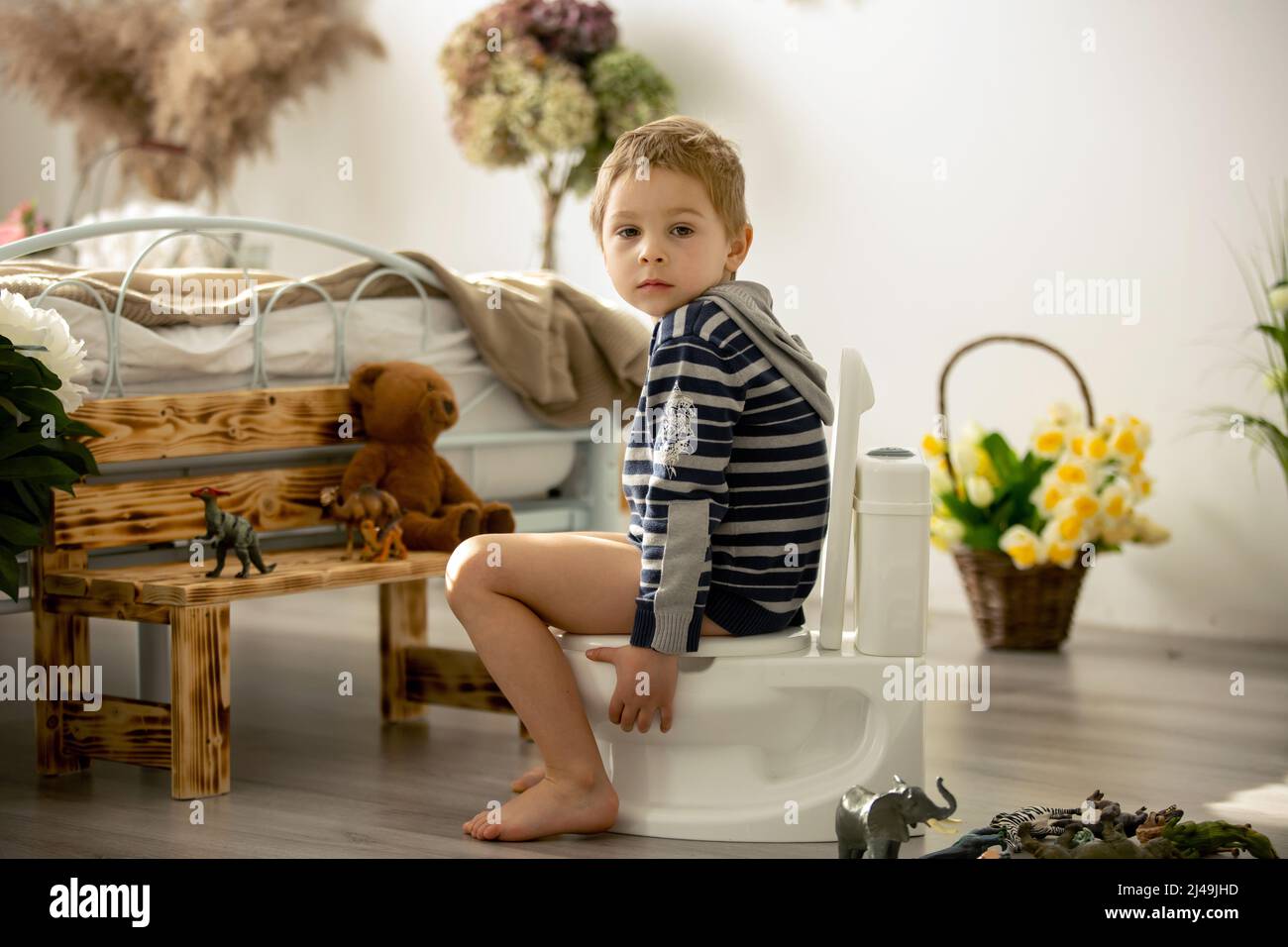 Cute toddler child boy using potty at home while playing with toys