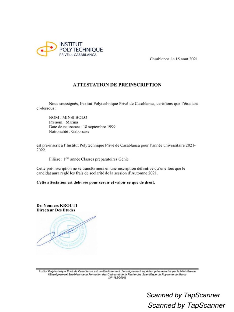 Attestation de pré inscription PDF