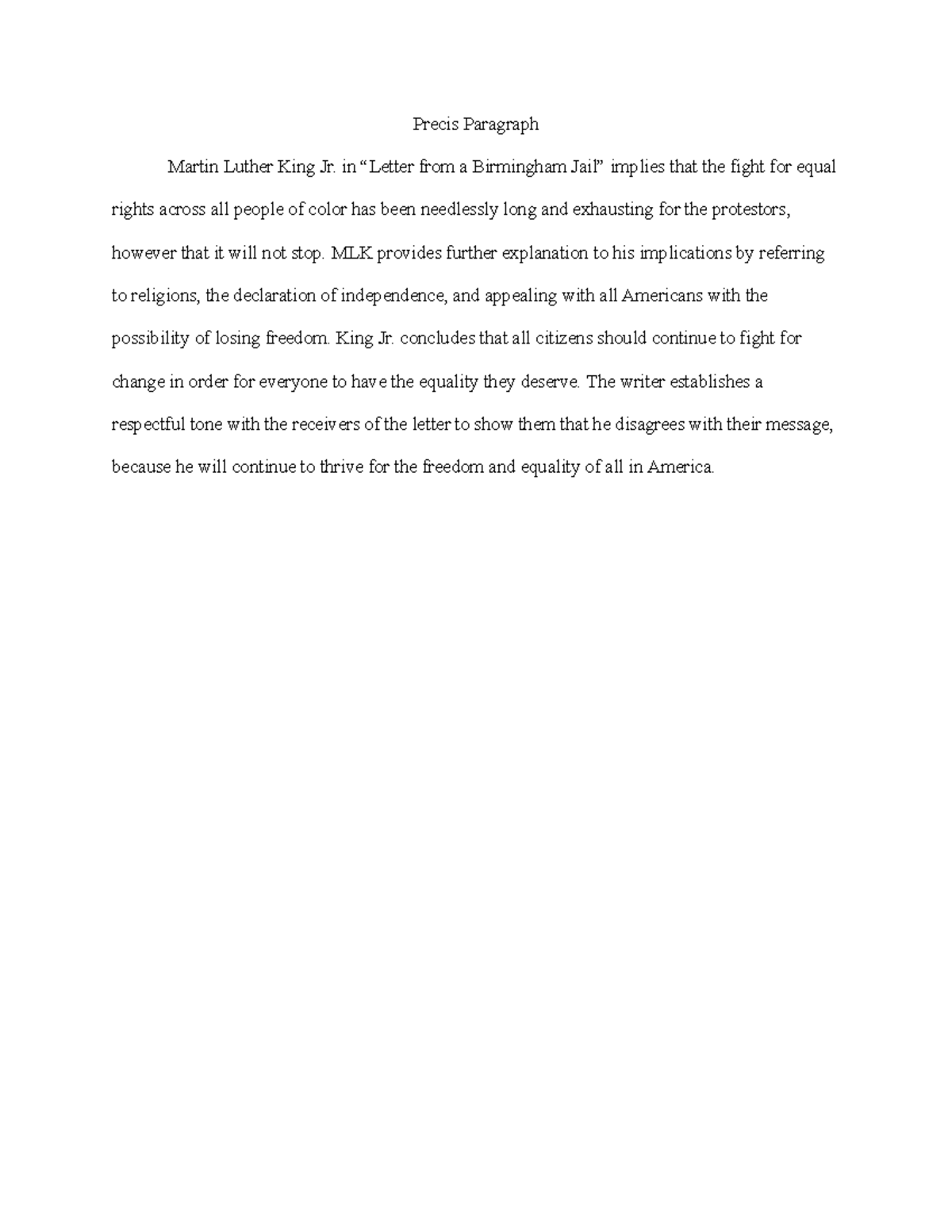 Precis Letter from a Birmingham Jail Precis Paragraph Martin Luther