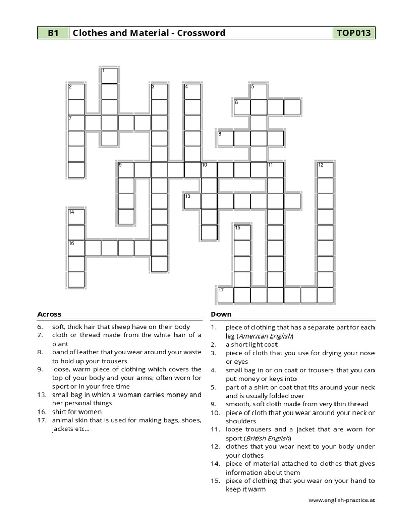 Clothes Material Crossword PDF Clothing Softlines (Retail)