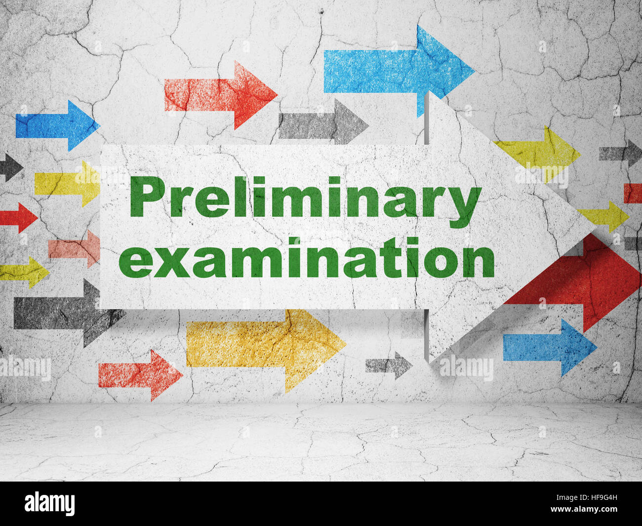 Learning concept: arrow with Preliminary Examination on grunge wall