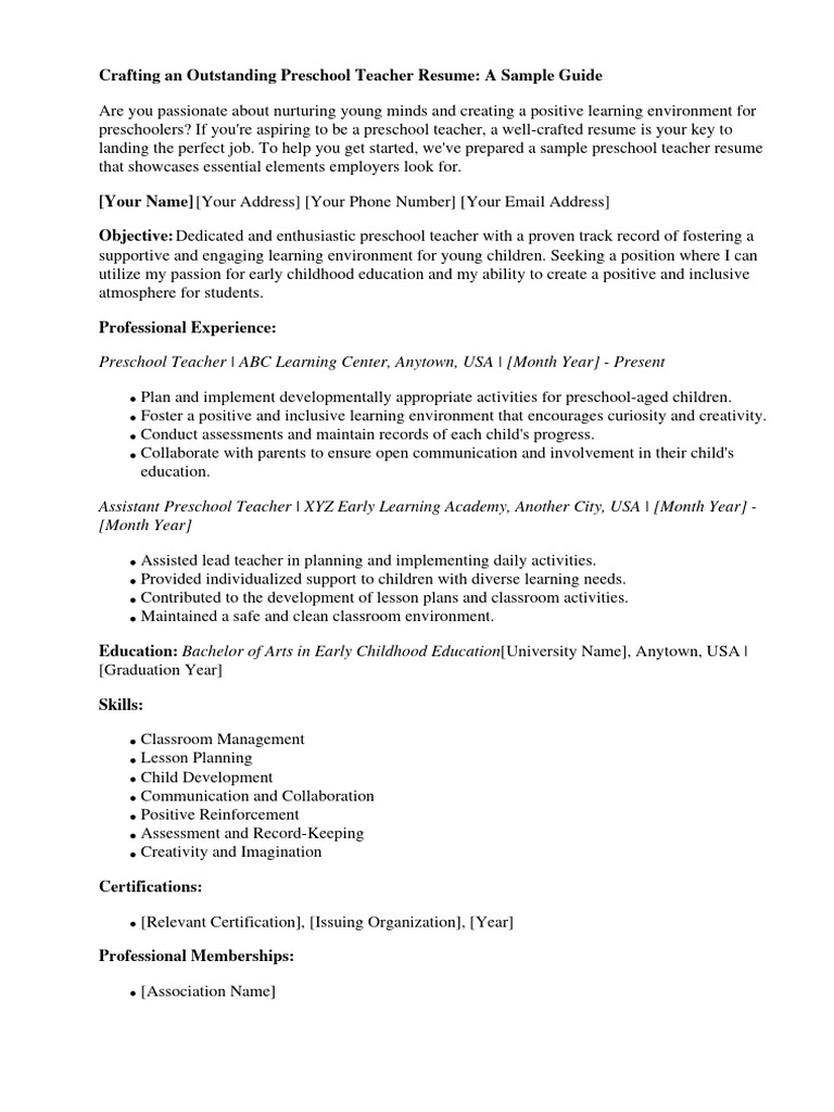 Sample Preschool Teacher Resume Template in Word PDF Google Docs