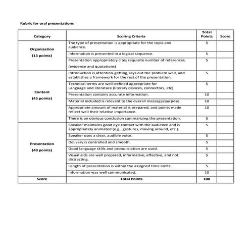 Rubric for ppt and oral presentation ESL worksheet by brdesa