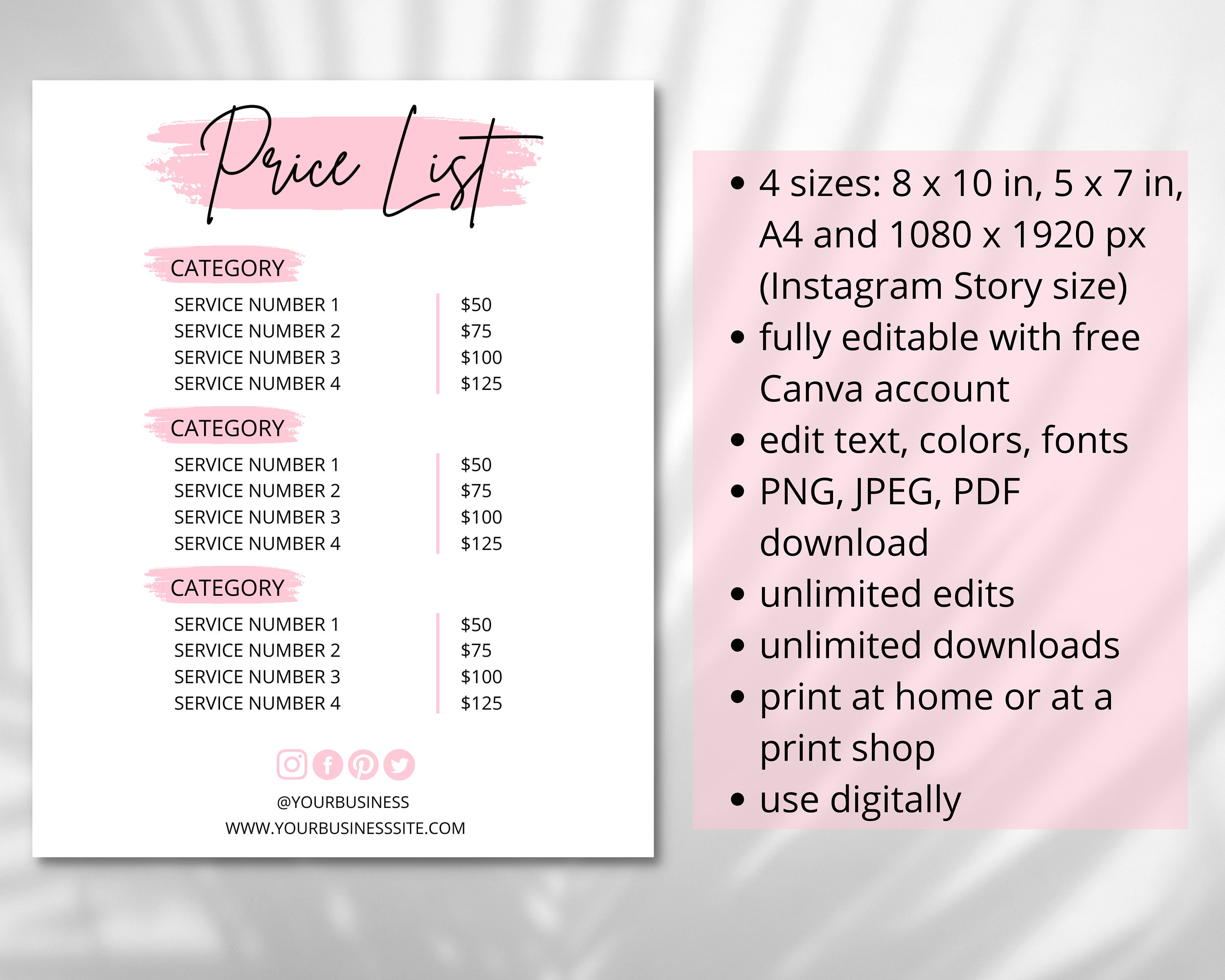 Price List Template Editable Printable Payment Sign Card Set Price