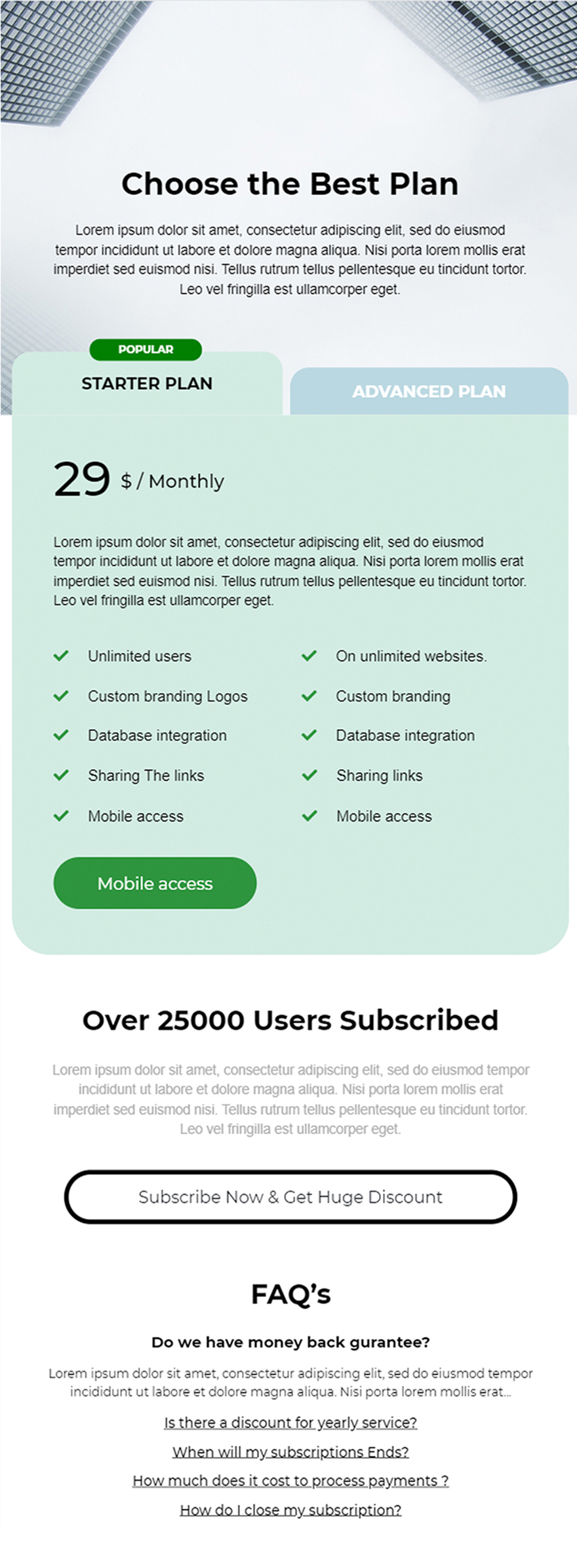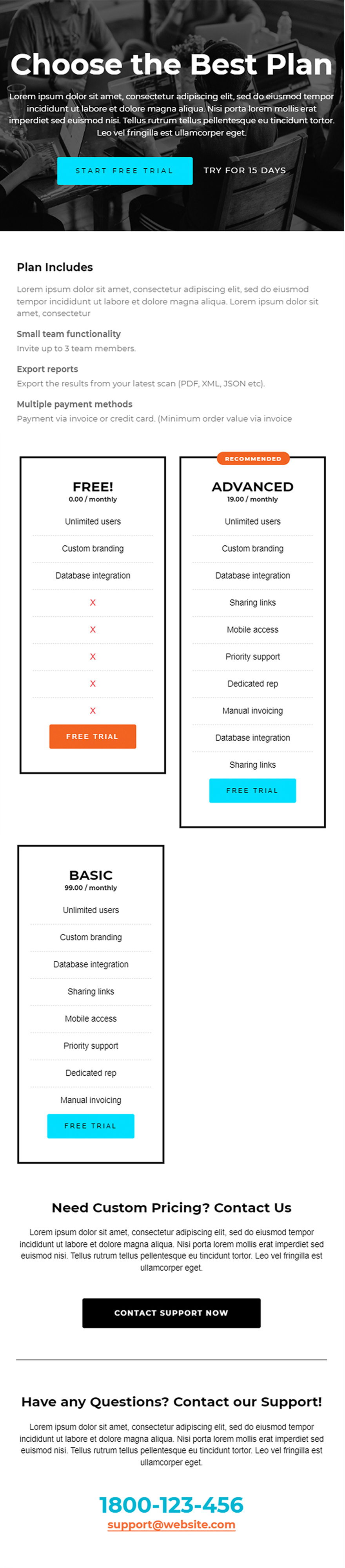 Landing page product package price for website Price chart template