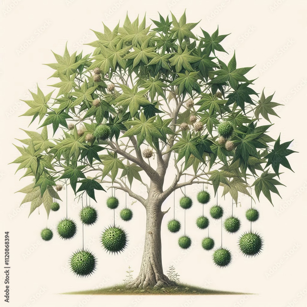 47 Sweetgum A tree with star shaped leaves and prickly seed pods Stock