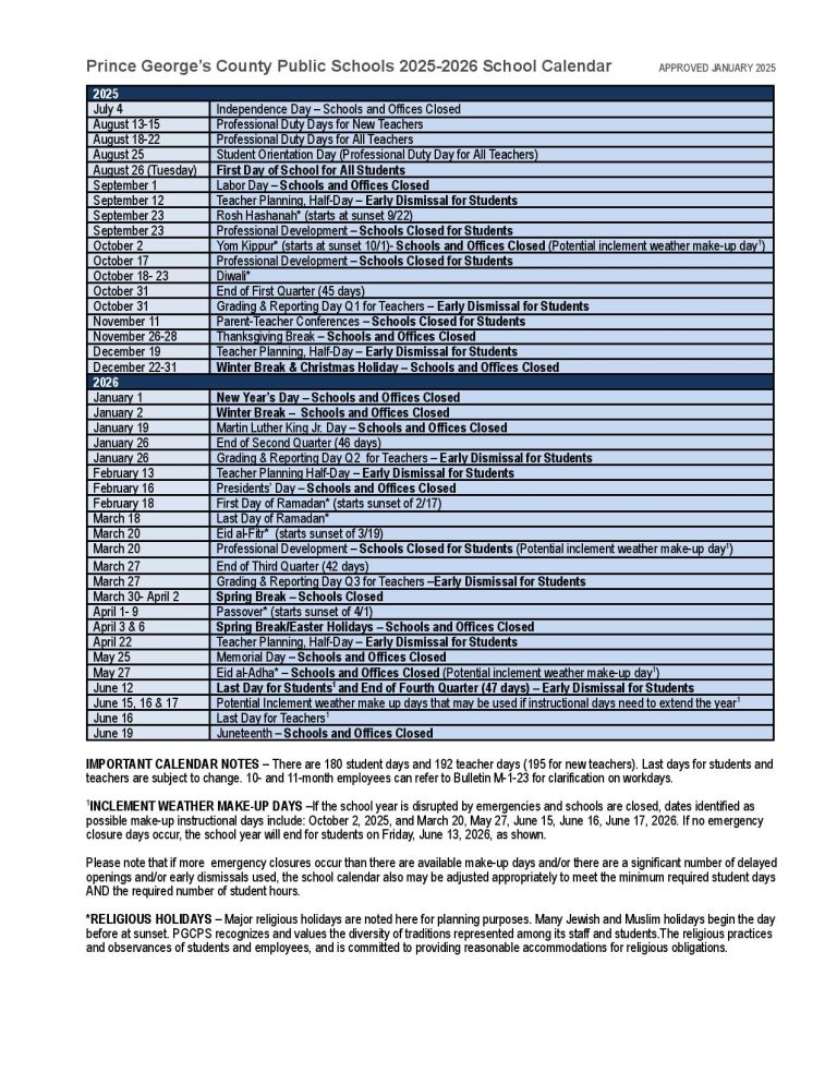 Prince George #39 s County Public Schools Calendar 2025 2026