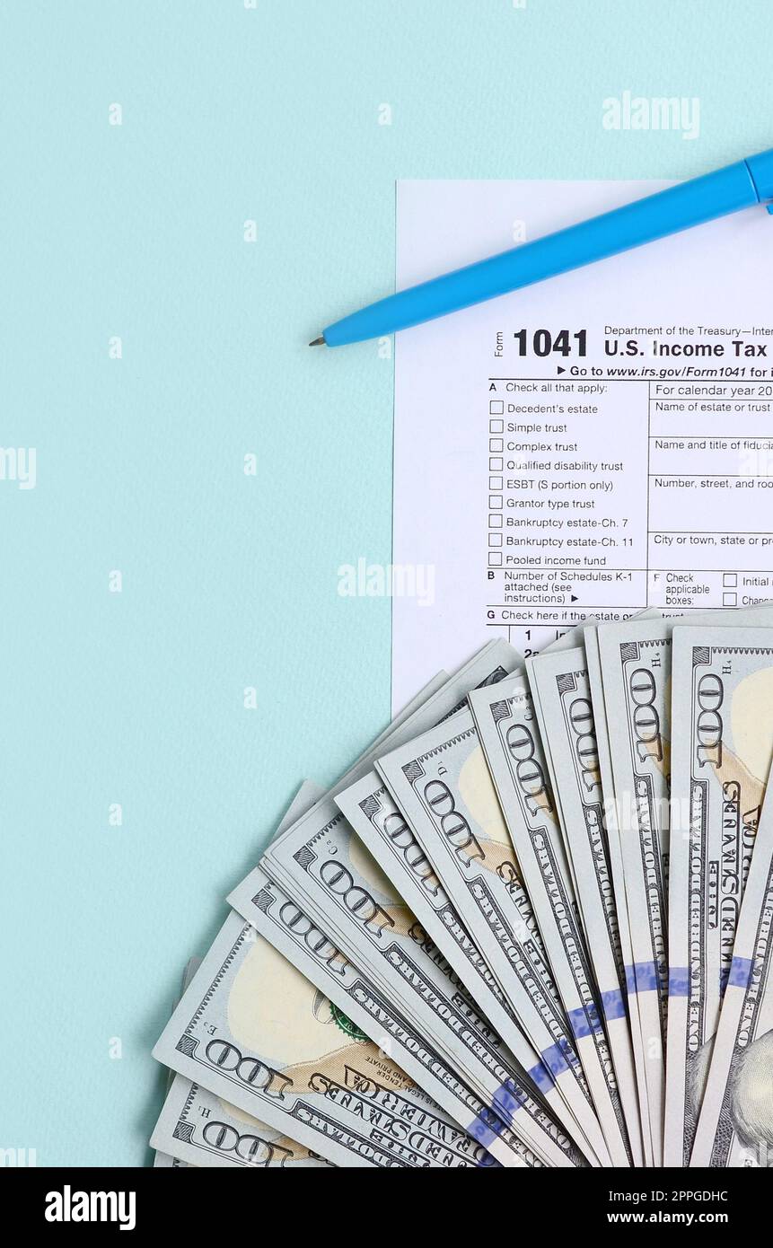 1041 tax form lies near hundred dollar bills and blue pen on a light