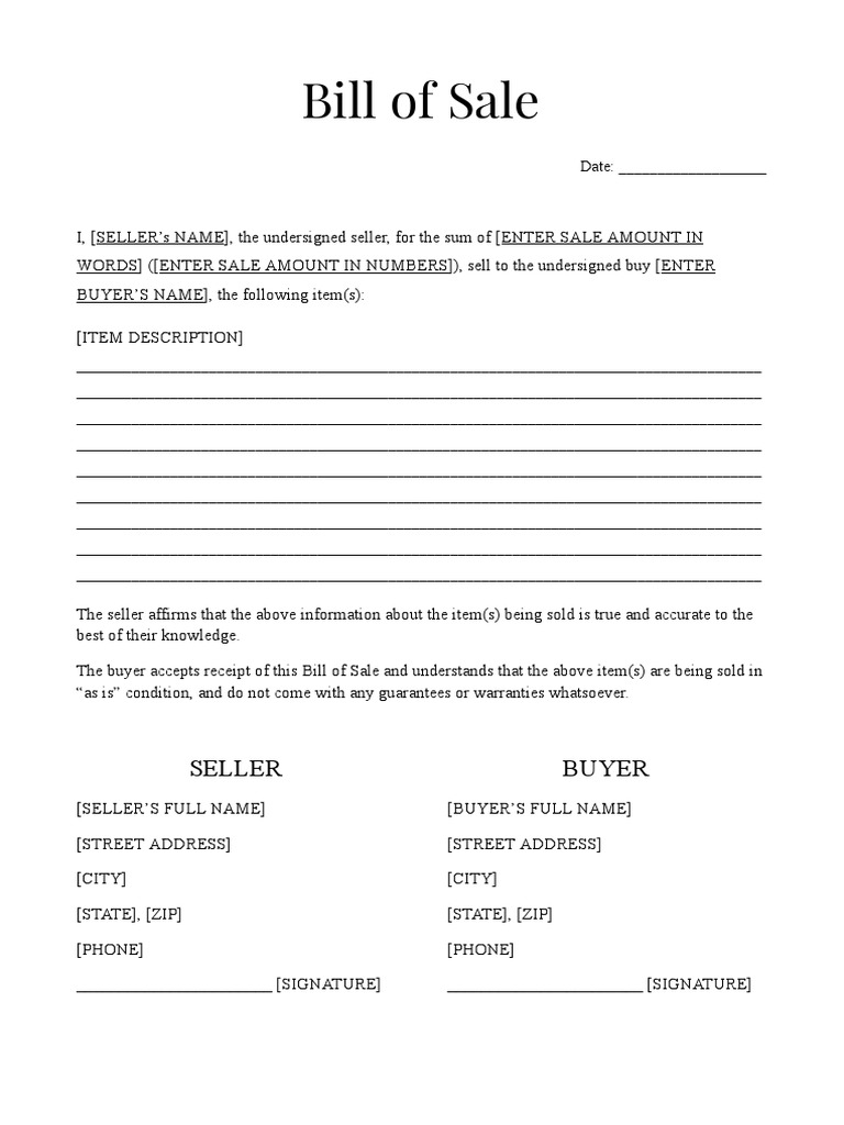 Generic Bill of Sale Form Template Free Blank Printable PDF