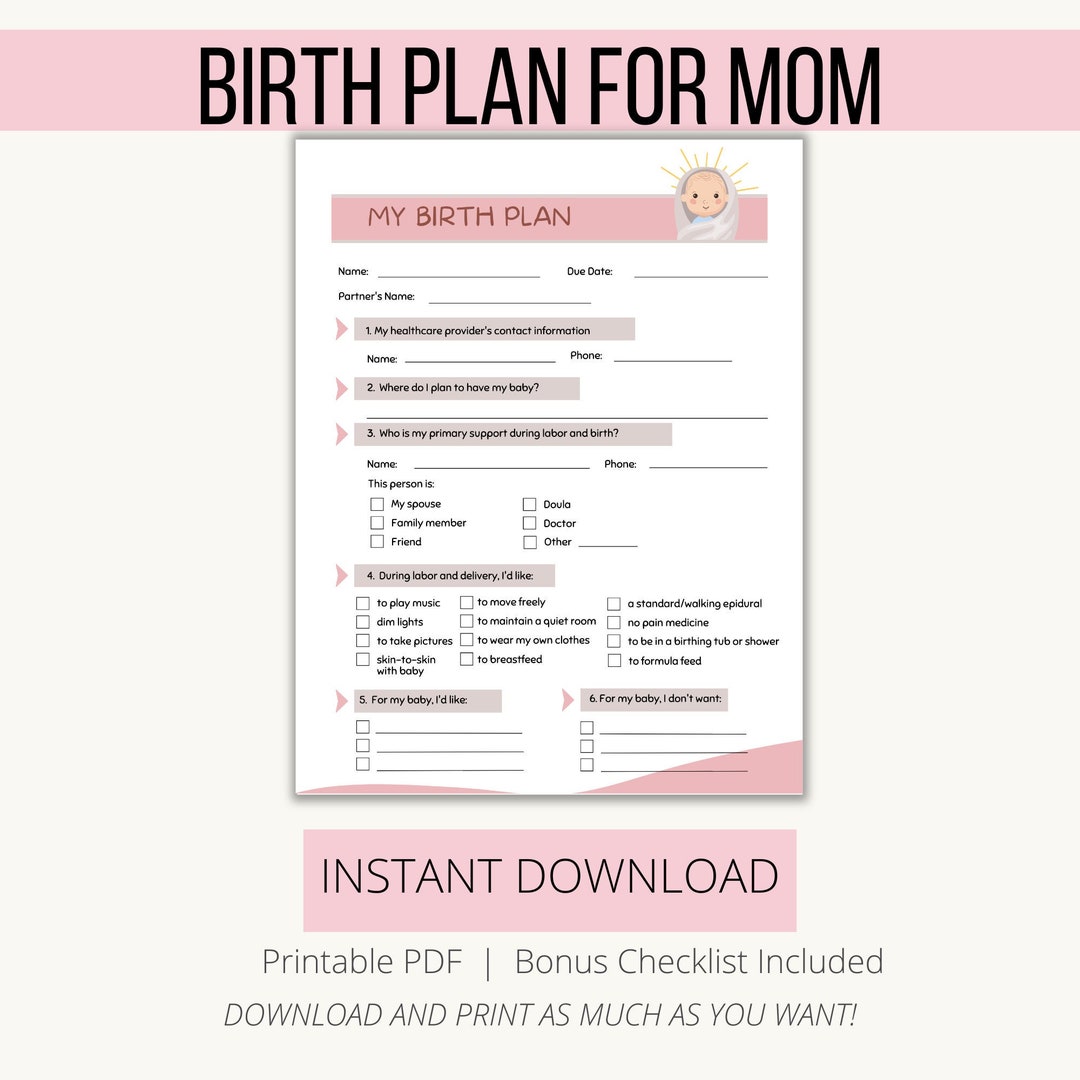 Birth Plan Template Printable for Pregnant Mom Expectant Mom Natural