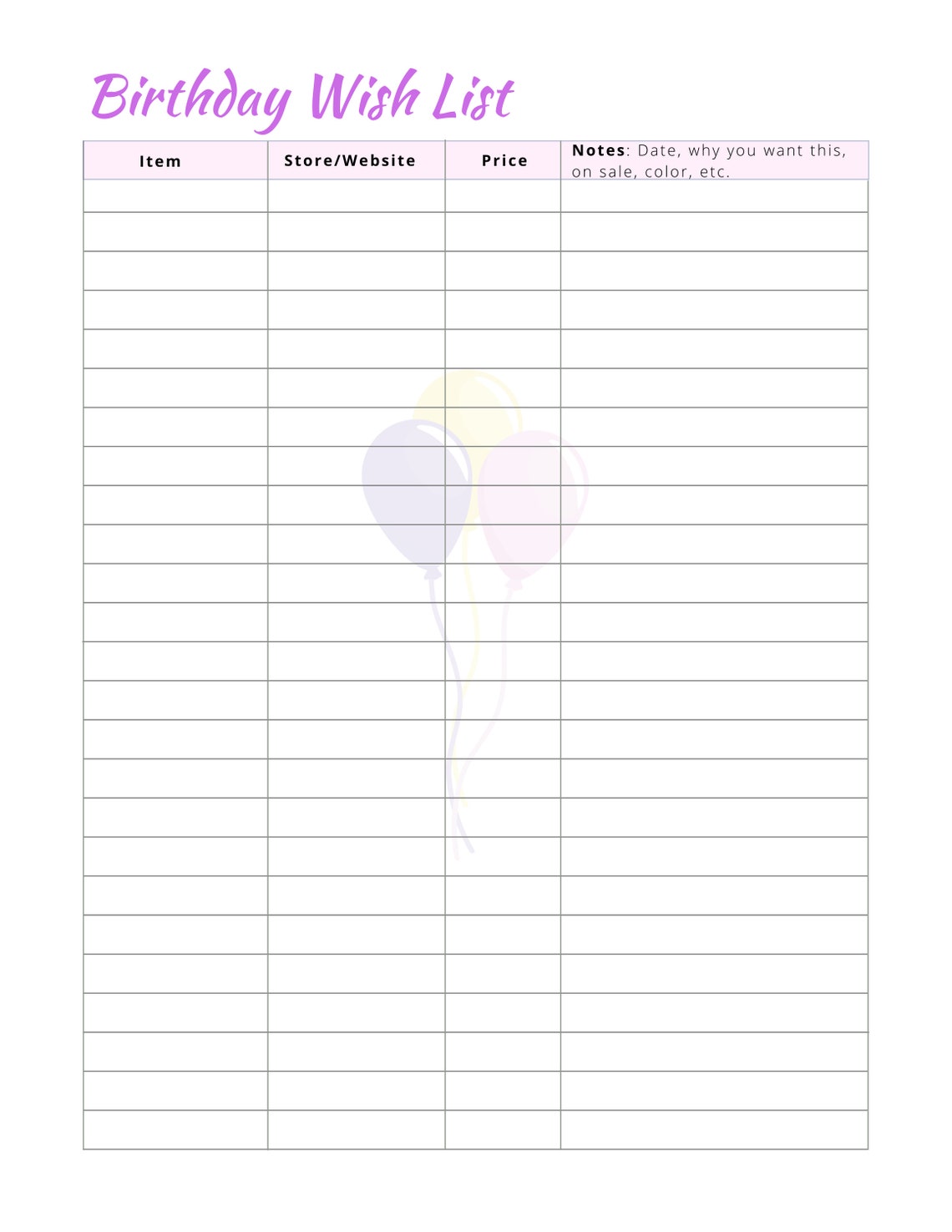 Birthday Wish List Template Violet Download Printable PDF