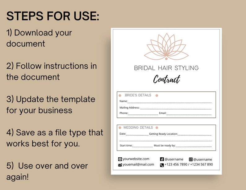 Bridal Hair Contract Template for Hairstylist Freelance Wedding Bridal