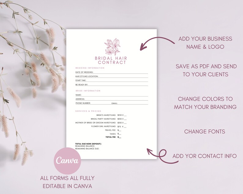 Bridal Hair Contract Template Canva Template Editable Hairstyling
