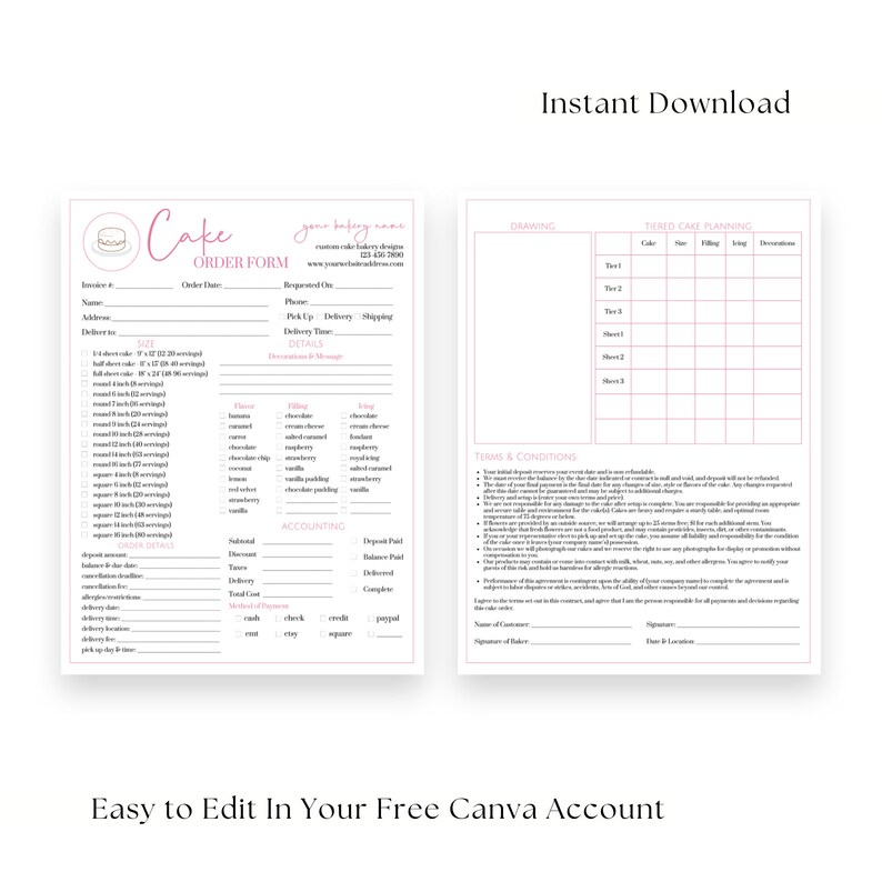 EDITABLE Cake Order Form Bakery PDF Printable Cake Business Form