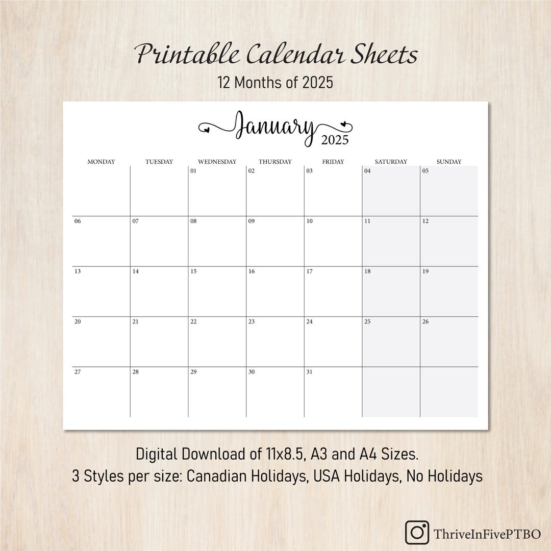 Printable Calendar 2025 Monthly Planner 2025 Calendar Sheet 2025 A4