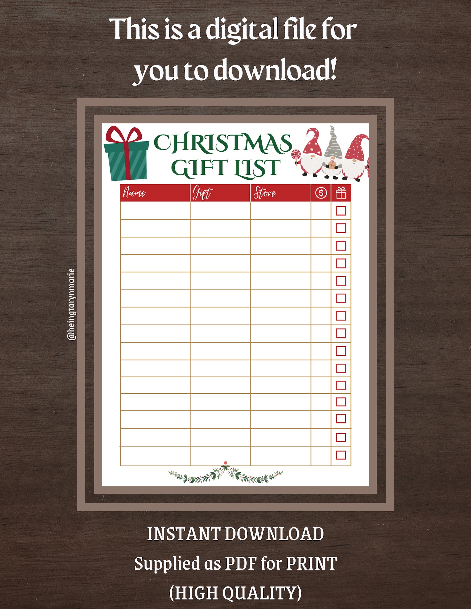 Christmas Gift List Printable Instant Download PDF Snazzy Printables