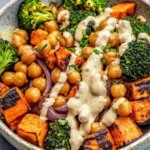 Roasted Veggie Chickpea Bowls with Maple Dijon Tahini Dressing