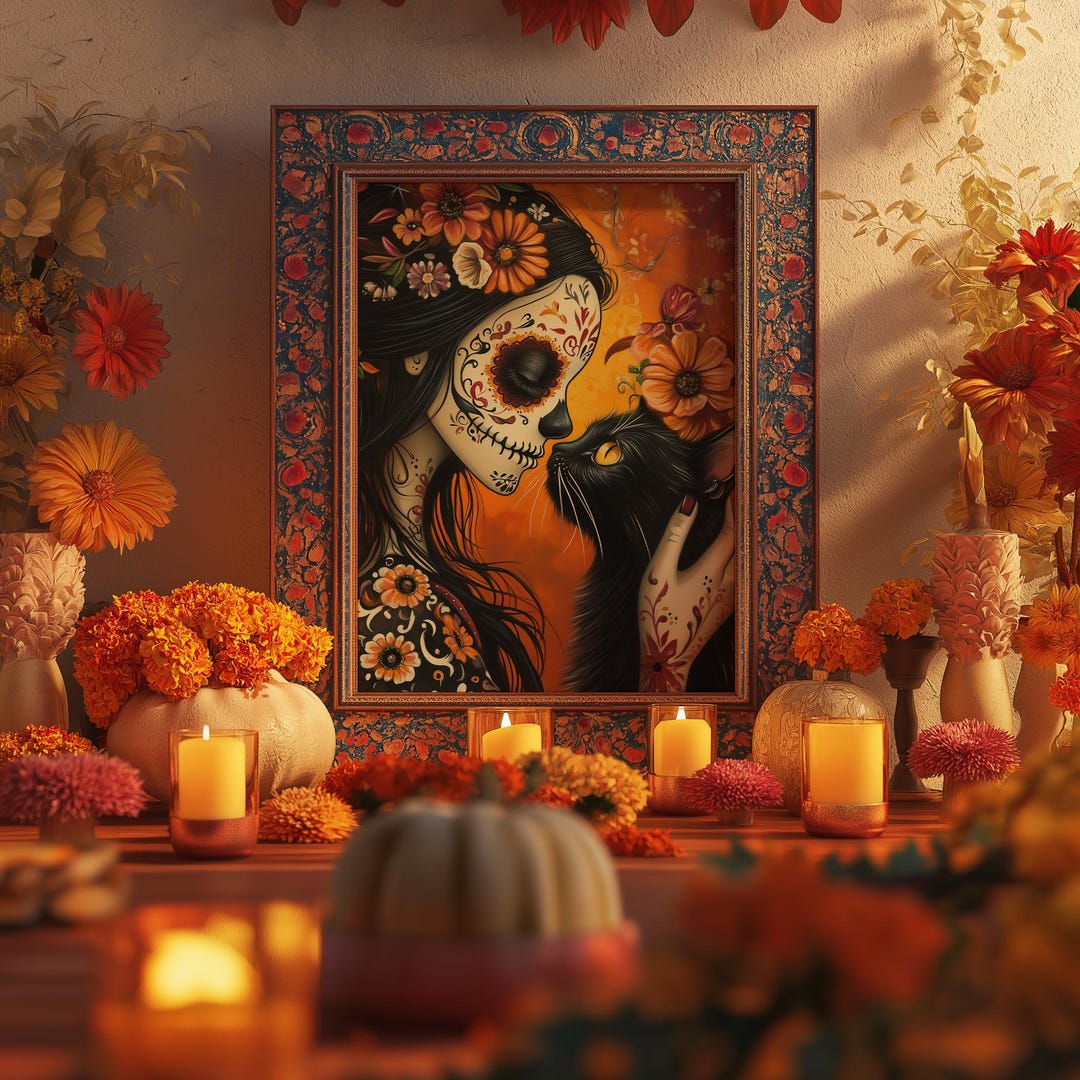 Día De Los Muertos Pet Wall Art Day of the Dead Girl and Cat Ofrenda