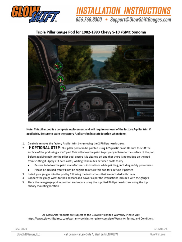 Pillar Pod Instructions for 1982 1993 Chevy S10 PDF
