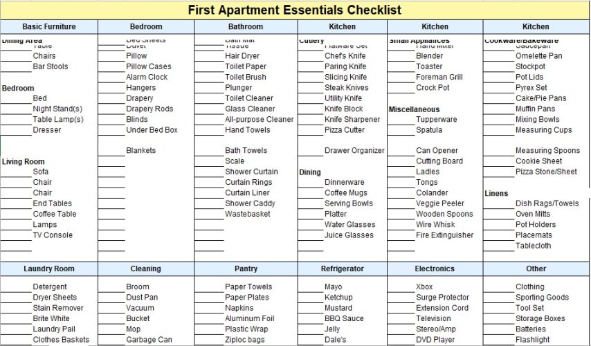Printable First Apartment Checklist Template Example Templateral