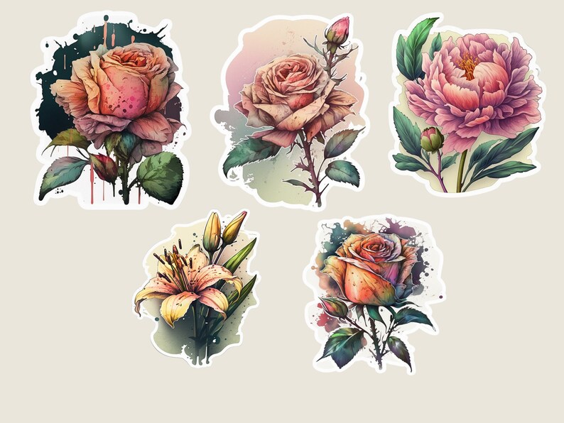 Printable Flower Stickers PNG Sticker Sheets Watercolor Rose