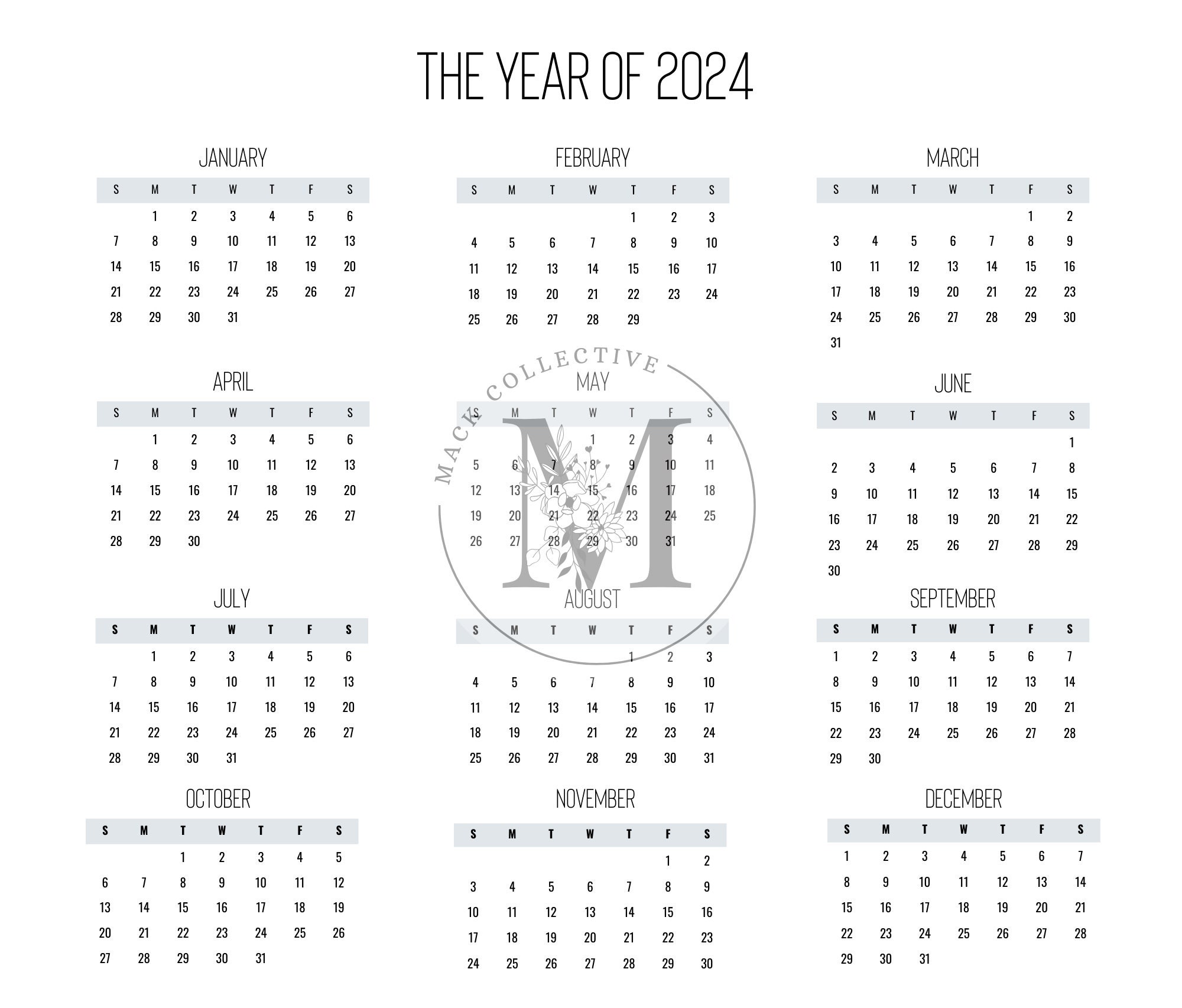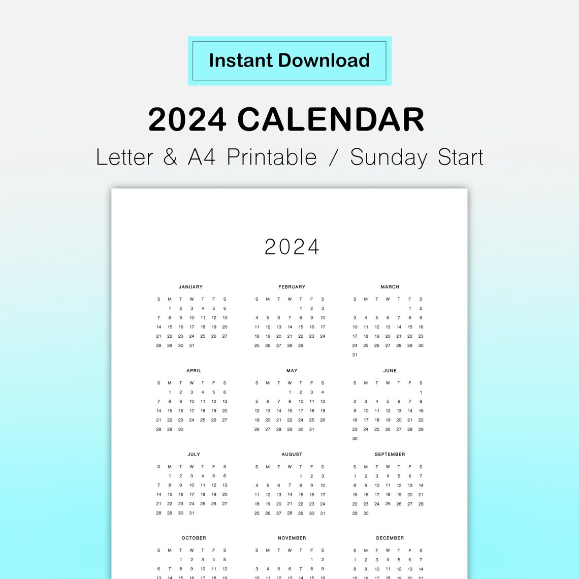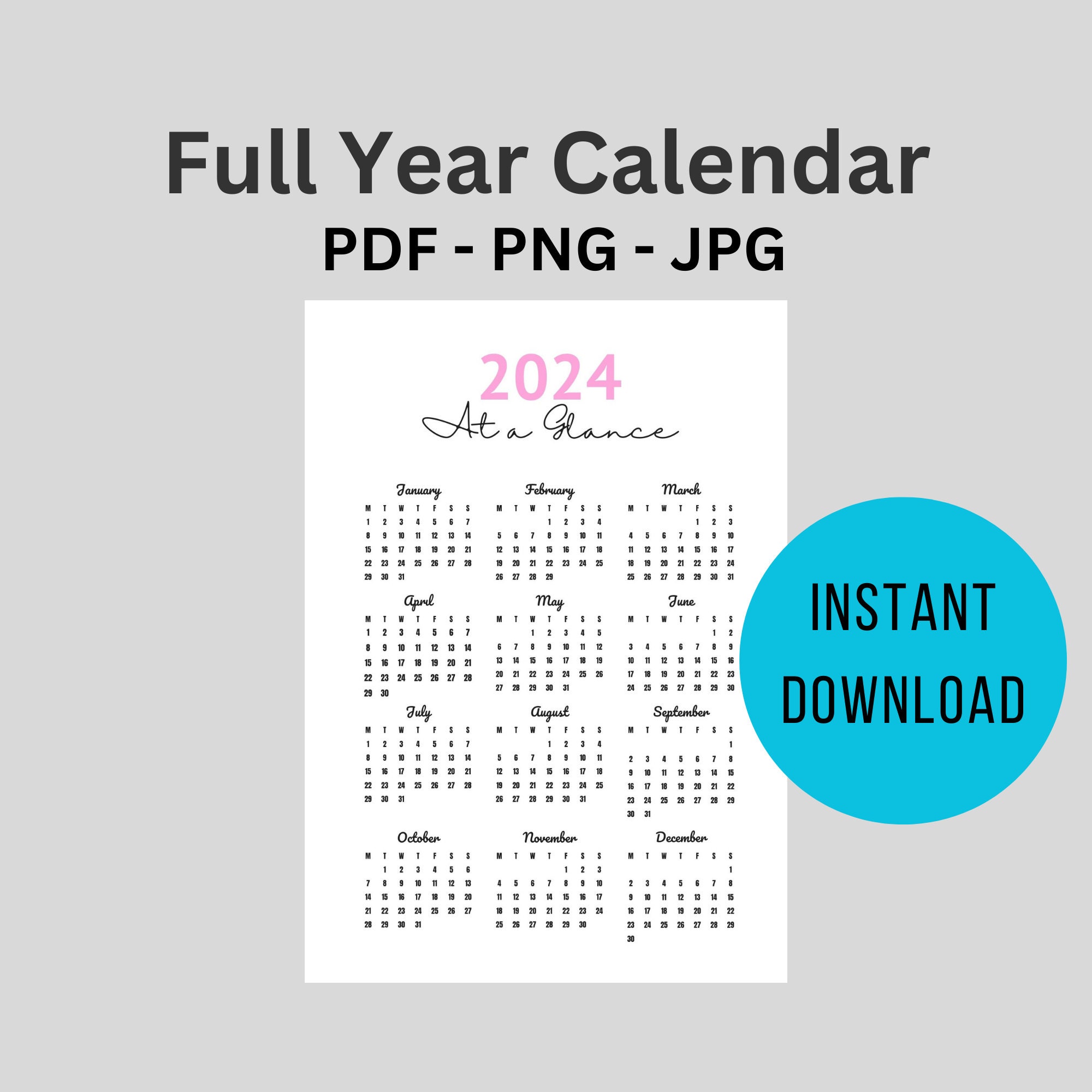 2024 Full Year Calendar Printable PDF 12 Month Wall Calendar Etsy