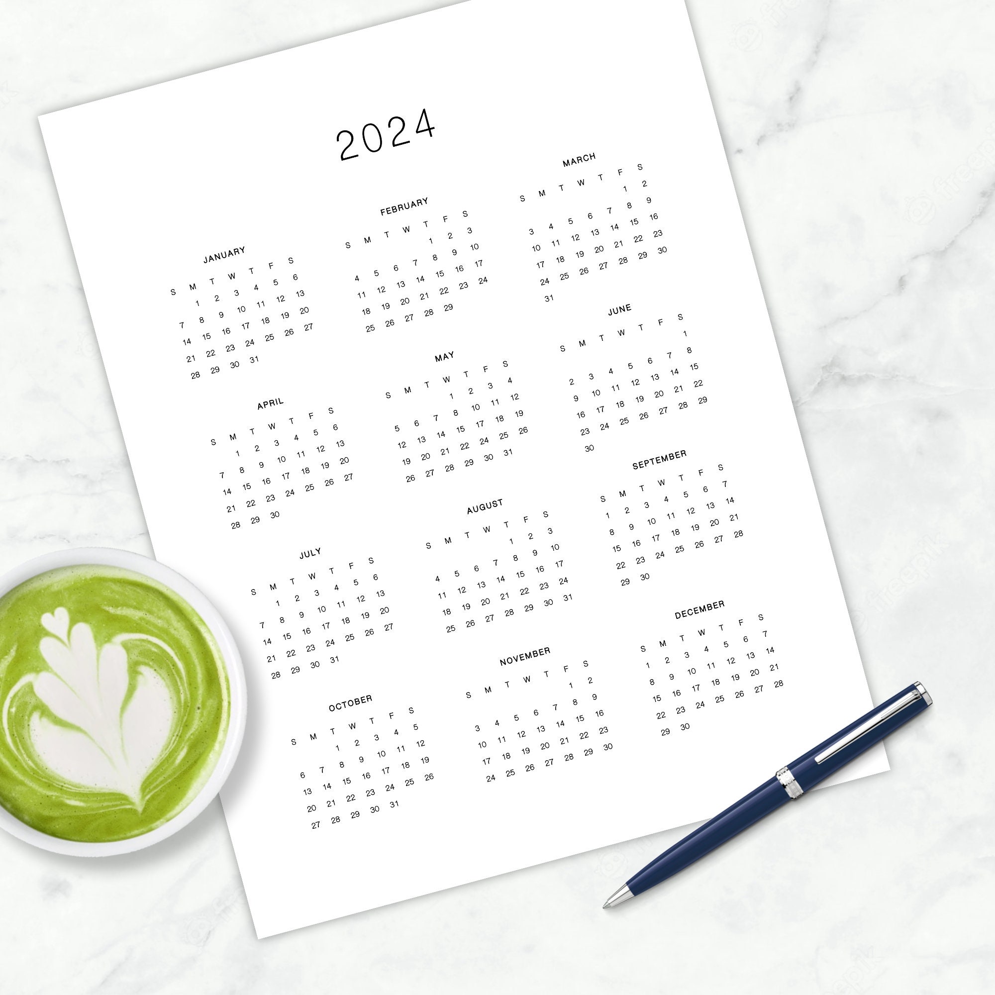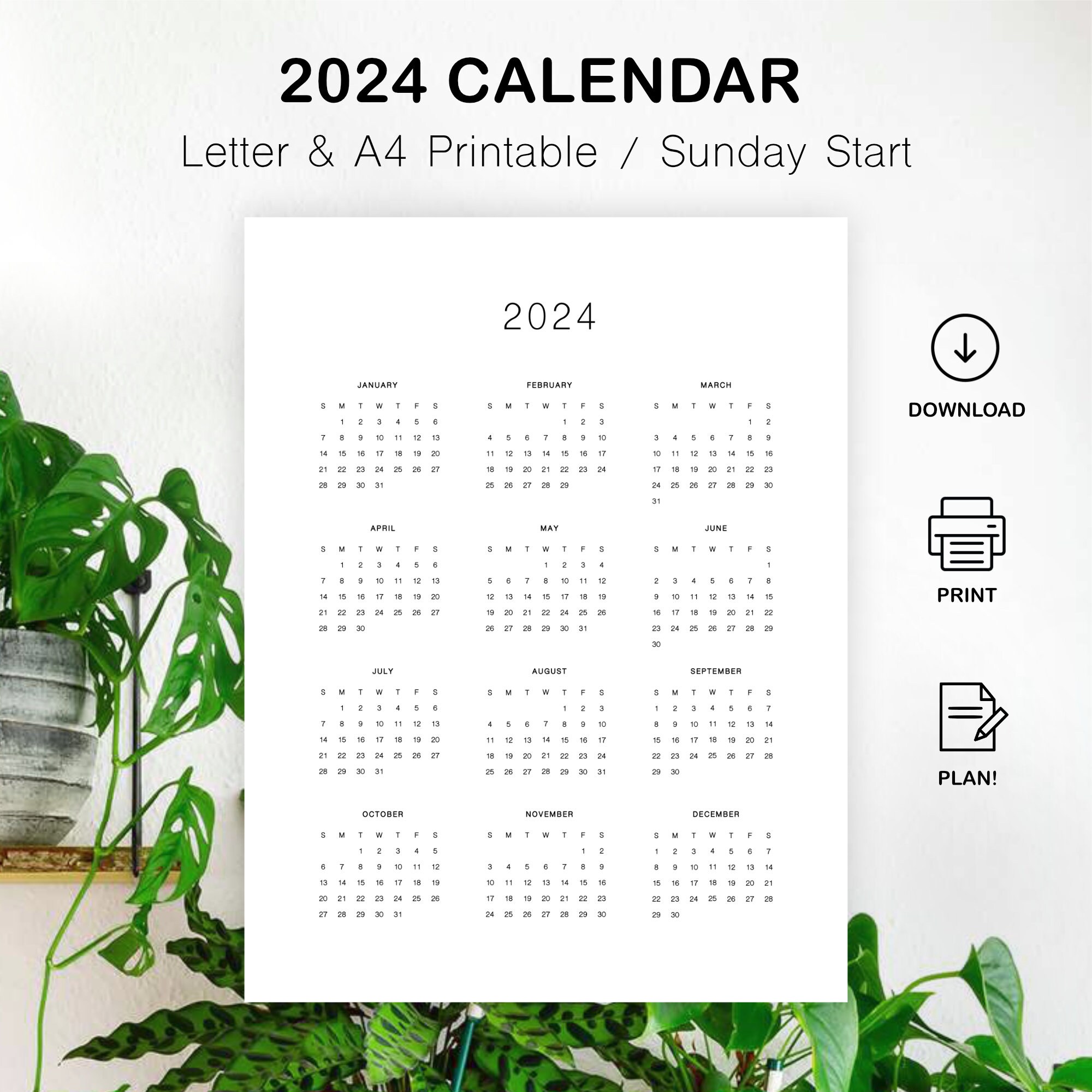 2024 Full Year Calendar Minimalist Yearly Calendar Printable Etsy