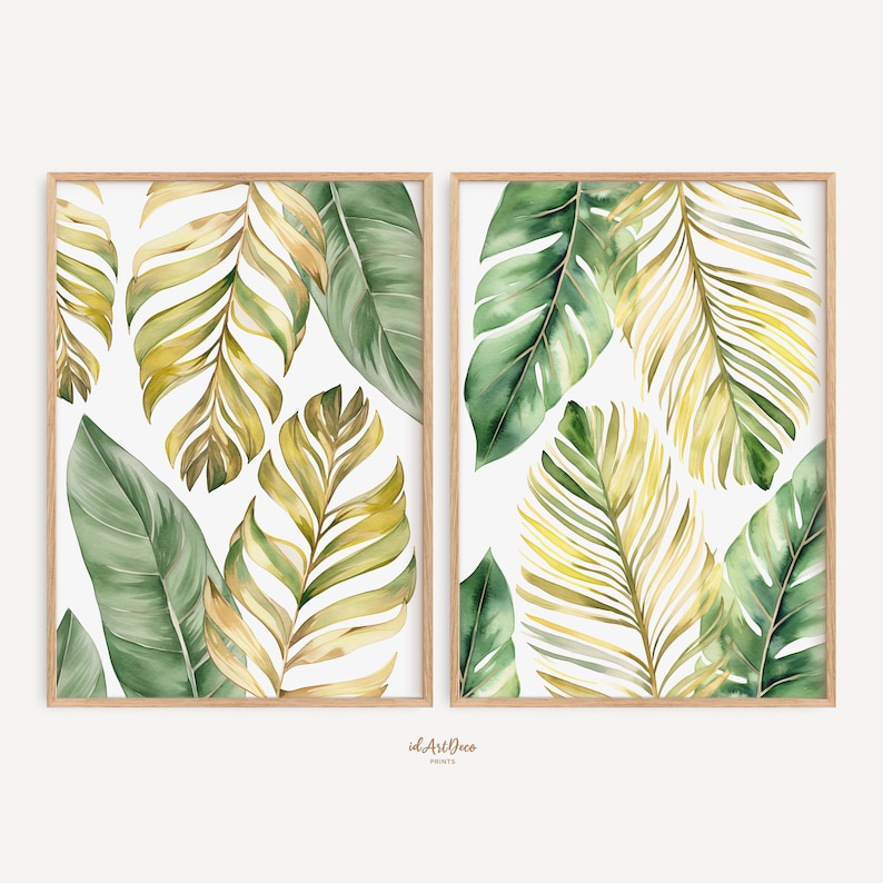 Tropical Leaf Watercolor Prints Set of 2 Palm Monstera Botanical Wall